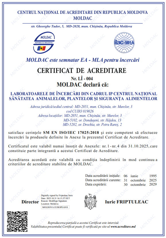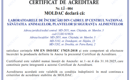În atenția operatorilor din domeniul agroalimentar! În urma reevaluarii de către MOLDAC și experții naționali și internaționali din Romania și Ucraina, la corespunderea cerințelor standardului SM EN ISO/IEC 17025:2018 «Cerințe generale pentru competența laboratoarelor de încercari și etalonari», I.P. Centrul Național Sănătatea Animalelor, Plantelor și Siguranța alimentelor (I.P.CNSAPSA) a primit Certificatul de acreditare Nr.LÎ-004 și Anexele Nr.1-LÎPA, Nr.2 –LDSA, Nr.3_LÎPA Dondușeni, Nr.4- LDSA Drochia, cu data acreditării curente din 31.10.2025.
